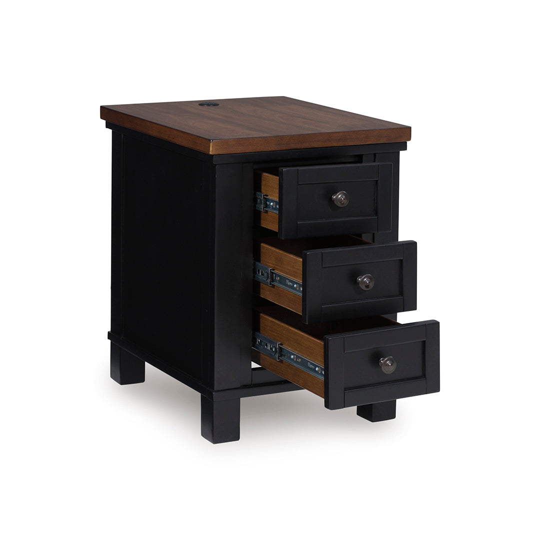 The Wildenauer Side Table adds hearty charm and smart function to your living room with its country style and casual good looks. Built with a combination of durable materials, this two-tone table blends strength with rustic appeal. The storage drawers easily keeps clutter at bay, while the added power supply makes it easy to charge multiple devices, adding a modern element to a timeless look. Rated at a “Good” quality level, the Wildenauer Side table offers a warm grounded aesthetic for any home.