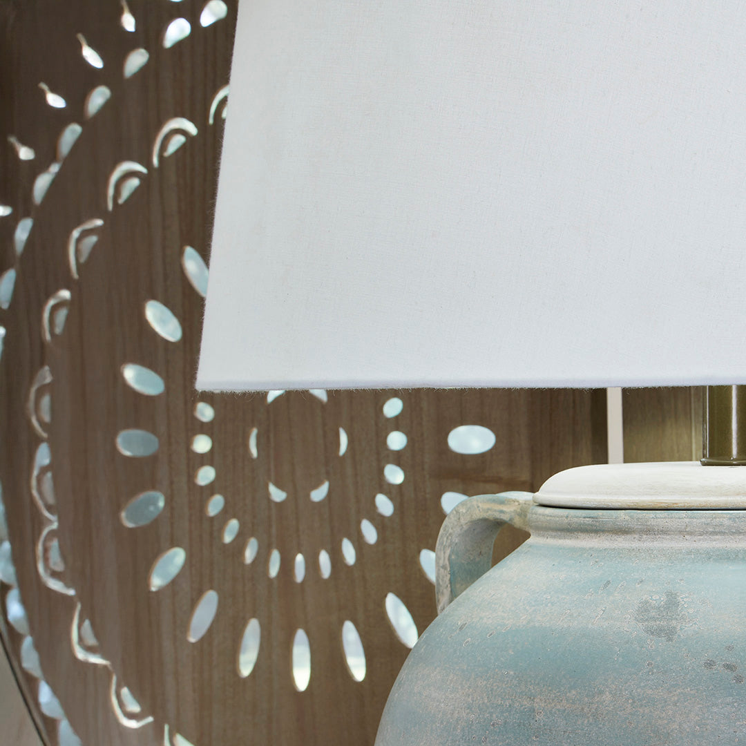 The Shawburg Table Lamp brings relaxed refinement to your space with its vintage-inspired design and country chic charm. Its smooth terracotta base in a greenish-blue hue has the look of a well-loved antique, complete with subtle distressing and decorative side handles that evoke classic pottery. Topped with a crisp white linen shade, this lamp offers a fresh contrast that enhances its nostalgic character. Rated at a “Good” quality level, the Shawburg Table Lamp is an effortless way to elevate everyday lighting with personality and charm.