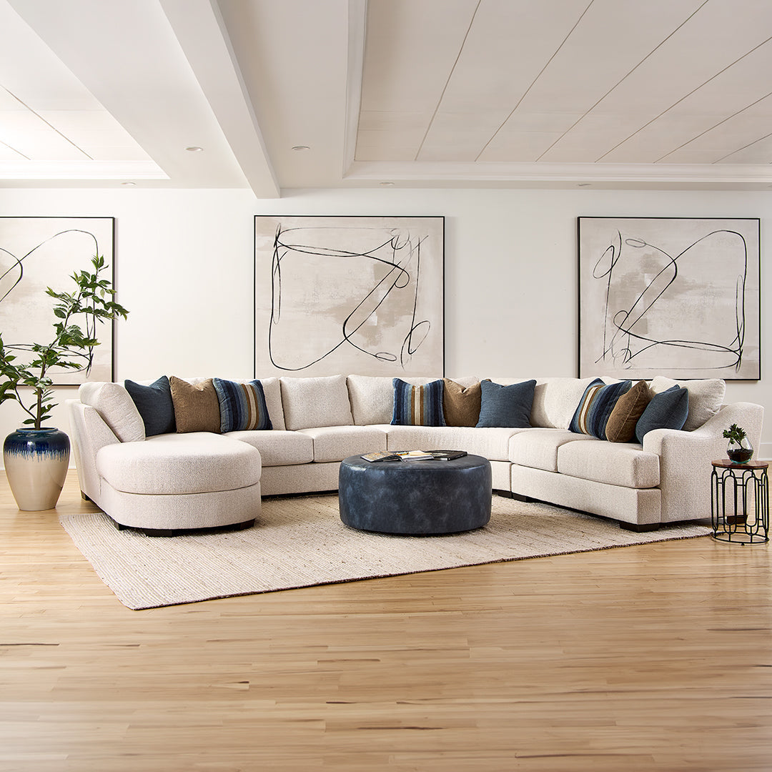 The Norwalk Sectional brings a fresh, fashion-forward energy to your living space with its curved silhouette, generous scale, and richly layered color palette. Dressed in creamy performance chenille fabric, this sectional makes a statement with its soft, textured finish that feels inviting and elevated all at once. Deep seating and a rounded bumper chaise create the perfect lounging zone, while the oversized down-blend accent pillows in earthy browns, denim blues, and bold stripes add a curated, designer touch. Rated at a “Better” quality level, the Norwalk Sectional blends causal luxury with a modern urban edge for a look that is both relaxed and refined.
