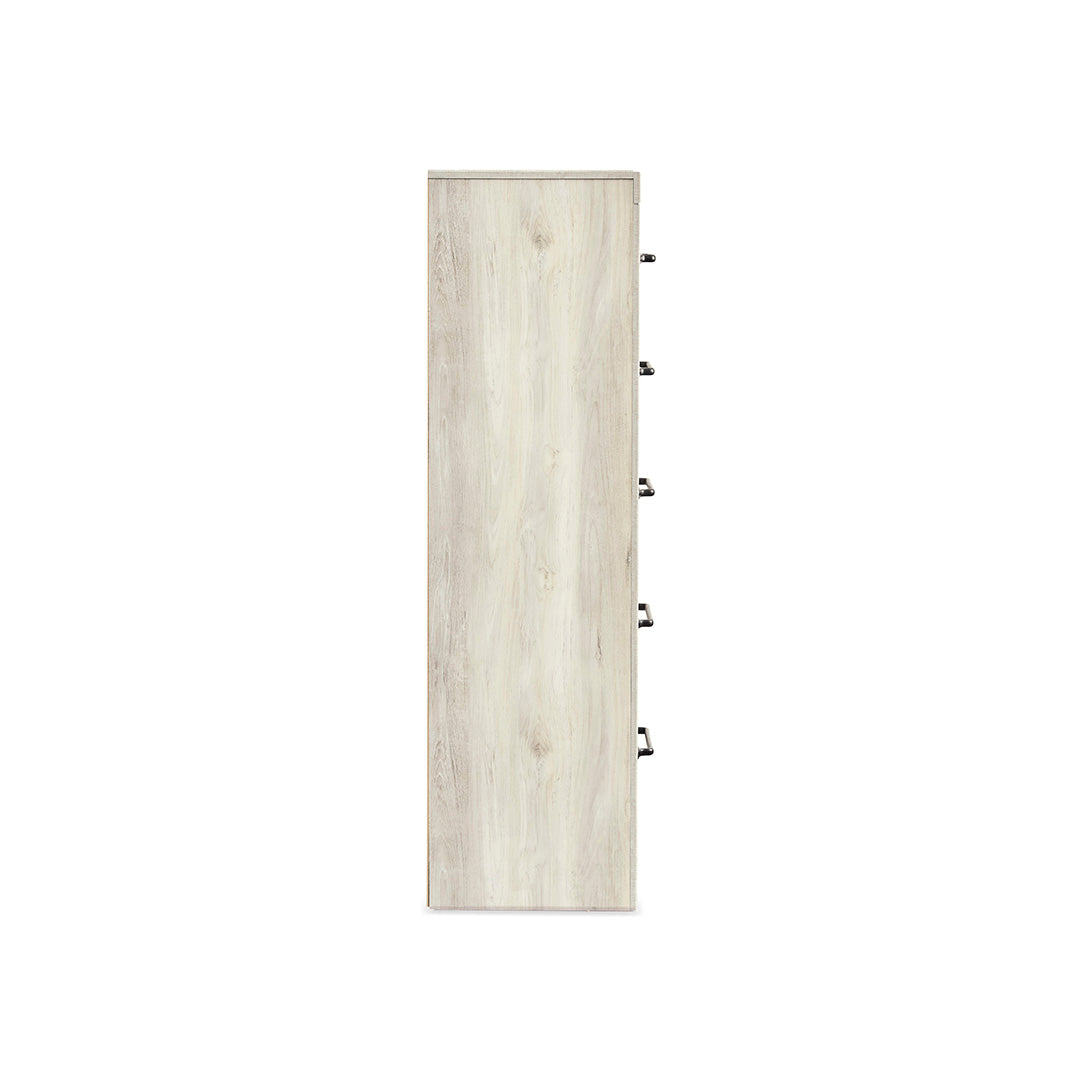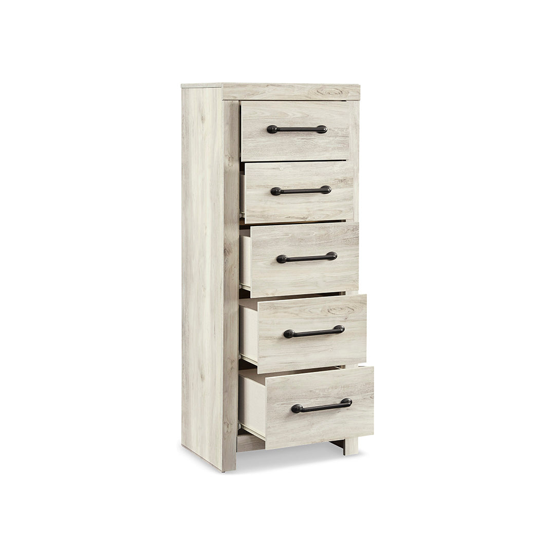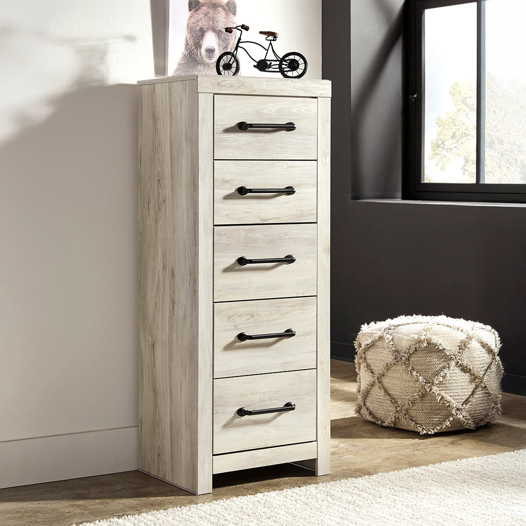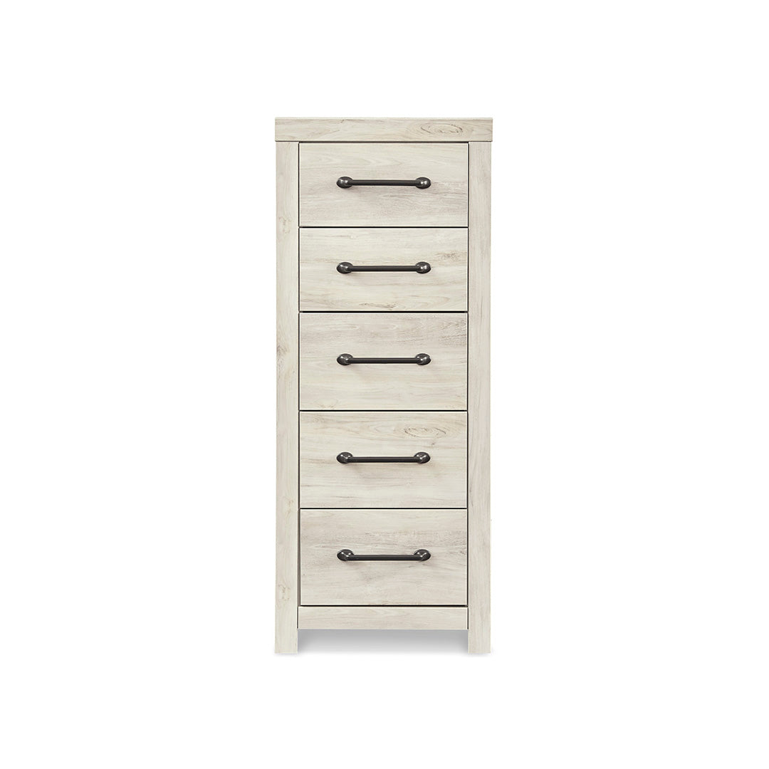 Qué encantadora interpretación del estilo rústico industrial. Ya sea en un loft moderno o en una casa de campo moderna, la cómoda estrecha Cambeck de 5 cajones se adapta a cualquier estilo. Su sutil paleta de blancos realza la veta sin disimularla, logrando ese aspecto desgastado que buscas. Diseñada para espacios pequeños, su perfil lineal y sus modernos tiradores son una refrescante novedad.