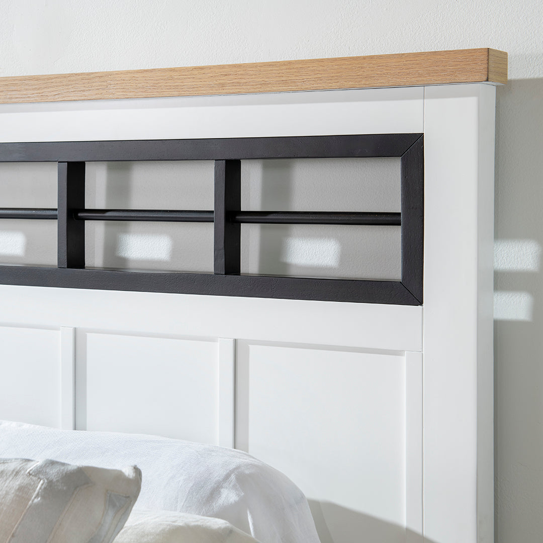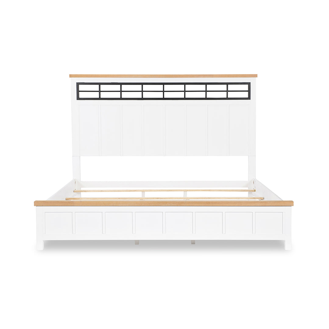 Bring a sense of light and character to your bedroom with the Horizons Bed, where classic charm meets modern ease. Crisp white finishes pair effortlessly with natural oak accents to create a clean, inviting look, while the black iron fretwork across the headboard adds a bold contrast that gives the piece its signature edge. This blend of farmhouse warmth and contemporary structure makes this bed a stylish anchor for a master, guest, or youth bedroom. Rated at a “Good” quality level, the Horizons Collection is a great way to refresh and elevate your space.