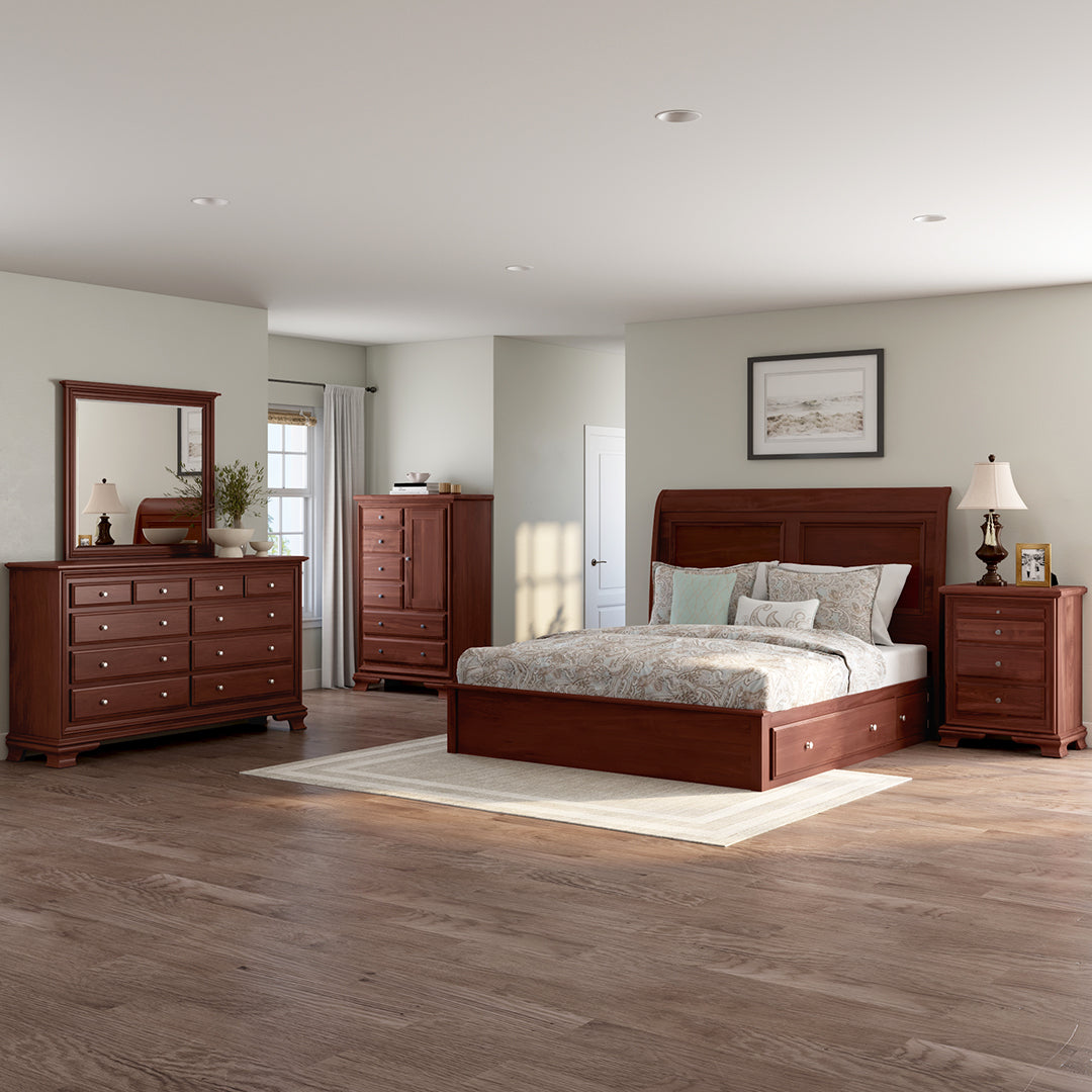 Constructed from Solid Cherry Wood, this Classic Armoire is a masterpiece of craftsmanship and design. It is inspired by traditional European influences, with perfect proportions with elaborate detail, making it a stunning addition to any bedroom. This heirloom-quality piece is handcrafted by Amish artisans in Ohio, ensuring impeccable construction. Featuring a 7-step finishing process and a catalyzed varnish topcoat, this armoire boasts a rich, luxurious look that will stand the test of time. The antique iron knobs add a touch of vintage charm, while the dovetailed drawers and full-extension ball-bearing glides offer smooth functionality. Rated at the “Best” quality level, the Amish Classic Armoire is an exceptional choice for your home.