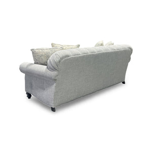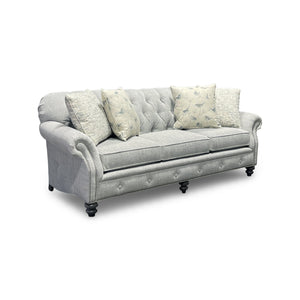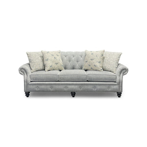 A refined take on classic luxury, the Anna Sofa brings timeless sophistication to any living room. With its iconic Chesterfield design, light gray upholstery, and button-tufted back, this sofa captures the essence of elegance. Made in the USA, this sofa features rolled arms, nailhead trim, and three distinct decorative front feet that add layers of charm and architectural detail. Two coordinated sets of accent pillows are included to enhance both comfort and style. Rated at a “ Best” quality level, the Anna Sofa not only impresses visually but also delivers lasting support for years to come.