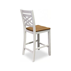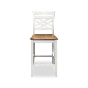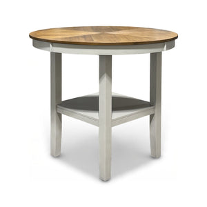 Add a touch of charm to your dining space with the Harlin Counter Height Dining Set. This 5-piece set includes a round counter-height table and four coordinating stools, perfect for casual family meals or gatherings with friends. The two tone finish features rich brown tops and a crisp white base. The hand-applied finish beautifully enhances the natural grain and character of the wood, giving each piece a warm, crafted look. Classic X-back detailing on the stools adds a timeless feel, while the built-in storage shelf beneath the table offers a practical space for dishes, décor, or everyday essentials. Rated at a “Good” quality level, the Harlin Counter Height Dining Set is a welcoming centerpiece for any dining space.