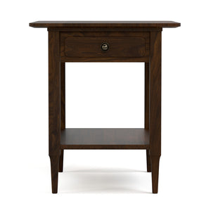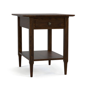 The Hudson Valley Collection looks at traditional Americana and its inspiring artisans through a contemporary lens, updating that warm, familiar style with variations that make it feel both nostalgic and new. The side table brings quiet sophistication to your living space with its simple, compact form and thoughtful detailing. Crafted from solid walnut and finished in a rich brown tone, this side table features a single drawer and fixed lower shelf, perfect for displaying your favorite books or decor. Tapered legs and clean lines gives a subtle nod to modern design while keeping its overall timeless aesthetic. Rated at a “Best” quality level, the Hudson Valley Side Table is a small-scale piece that leaves a lasting impression.