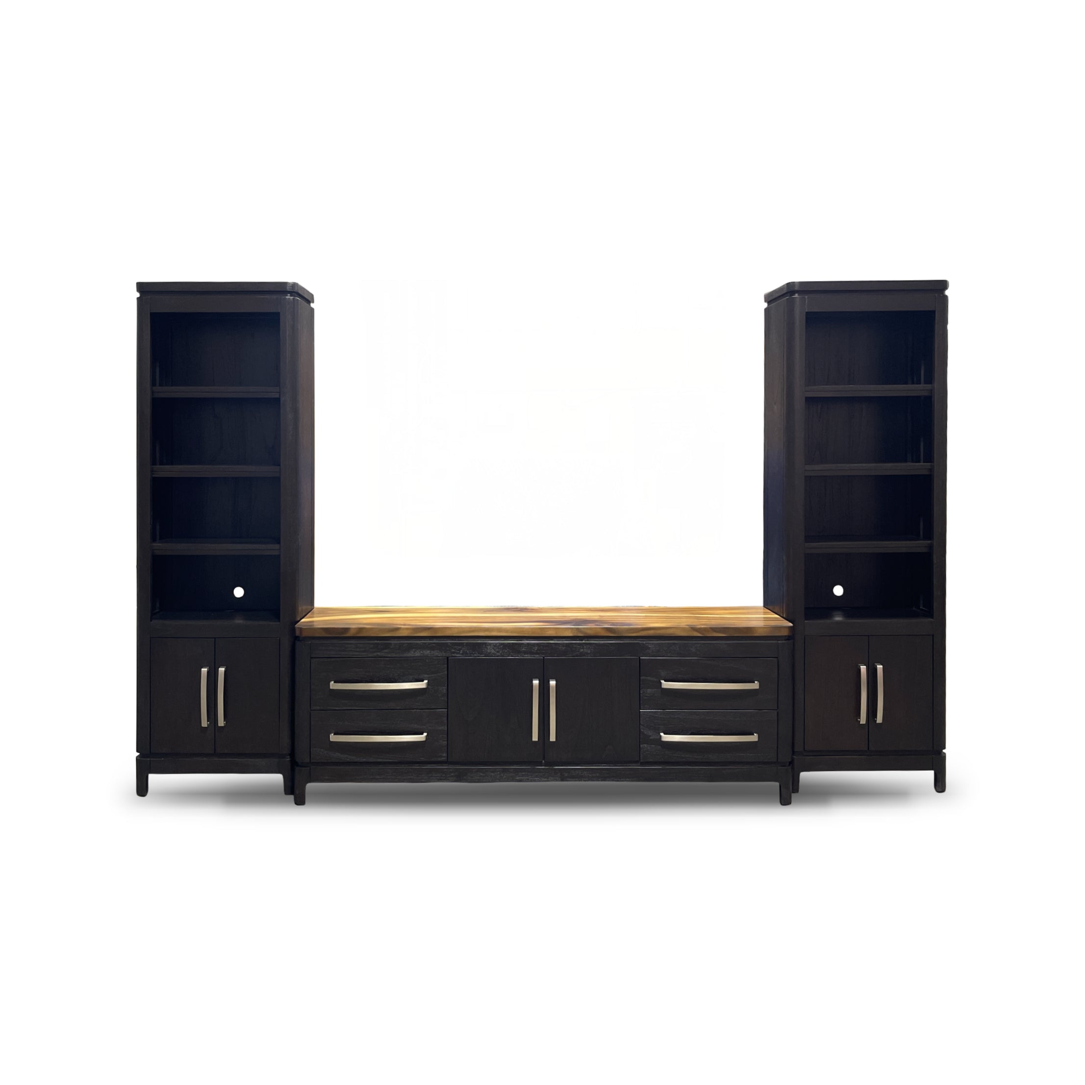 The Oakton Entertainment Center delivers streamlined convenience and bold design in one cohesive living room solution. Centered around a 72-inch TV console, this set includes two bookcase-style media piers with adjustable shelving and built-in wire cutouts for easy organization. Four drawers and three cabinets provide generous storage for everything from remotes to game systems, while an optional bridge piece connects the piers to complete the look with architectural cohesion. Finished in a rich chocolate brown and accented with exclusive hardware, this entertainment center brings modern style to your space, highlighted by clean lines, rounded corners, and oversized pull handles. Rated at a “Better” quality level, the Oakton Entertainment Center elevates both your style and your viewing experience.