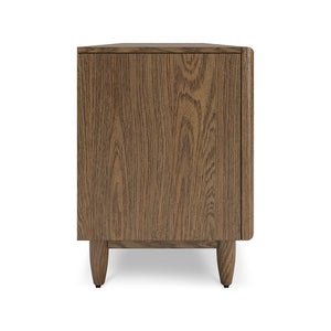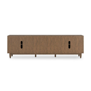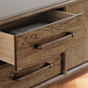 The Roane TV Stand brings a bold, mid-century modern presence to any living room or entertainment space with its warm brown finish and clean, understated lines. Its urban-inspired silhouette is elevated by round tapered legs and a balanced design that feels both retro and refined. Smooth-gliding drawers and sleek double-door cabinets keep clutter out of sight, letting the style speak for itself. Thoughtful cord management cutouts maintain the minimalist look while supporting your media setup. Rated at a "Good" quality level, the Roane TV Stand is designed for those who appreciate timeless aesthetics with everyday practicality.