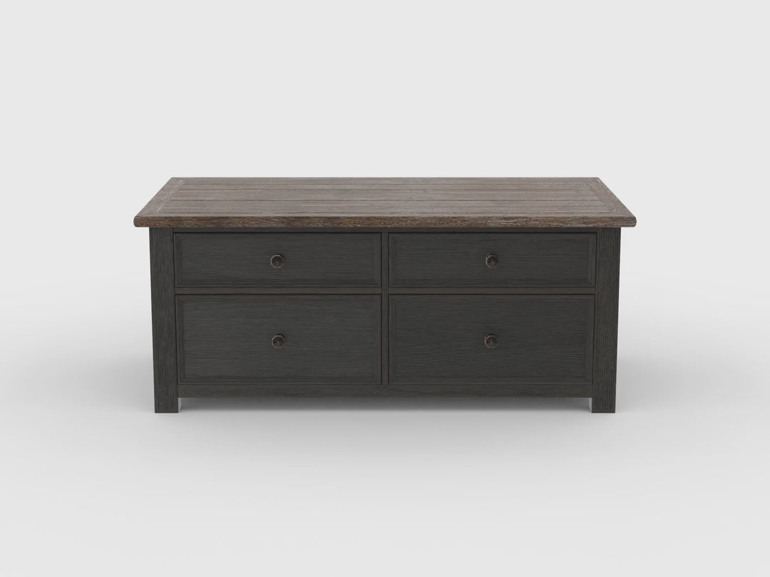 Shabby chic with a hint of down home country. This lift-top coffee table with textured black finish is all the talk of today’s design world. Wood grain shows through the weathered gray-brown top in all of its earthy pleasure. Framed drawers are adorned with lovely traditional hardware. Smooth-gliding drawers make it easy for you to store away your belongings in style. Lift top transforms your space into a workstation without a hitch.