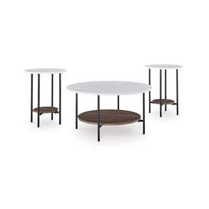 The Wrenwich Table Trio offers a complete, coordinated look for your living room with one affordable purchase. This 3-piece set is designed with a striking mix of faux Carrara marble tops, sleek black tubular metal frames, and open shelves in a light natural wood grain finish. The clean lines and smaller scale make it ideal for tight spaces, while the blend of materials adds layered visual interest without overwhelming the room. Found in our Outlet Locations and rated "Good" in quality, the Wrenwich Table Trio is a standout addition for everyday contemporary, sophisticated living.